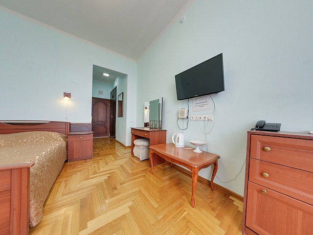 В номере: кровать полутороспальная, комплект - кресло (раскладное), пуфик, тумба прикроватная, журнальный столик, стол туалетный с зеркалом, встроенный шкаф, тумба TV, телевизор, холодильник, кондиционер, телефон