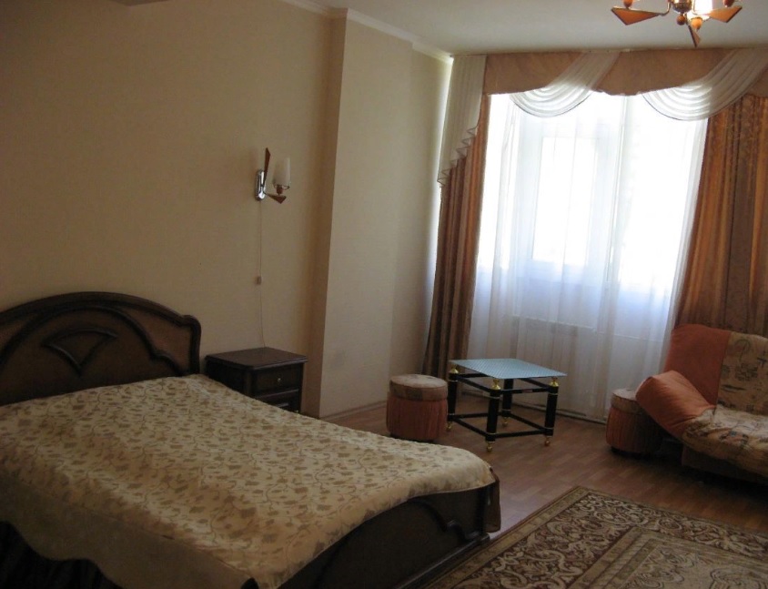 В номере: Двуспальная кровать, кофейный столик, платяной шкаф, телевизор, холодильник, Wi-Fi, фен, белые махровые халат и тапочки.